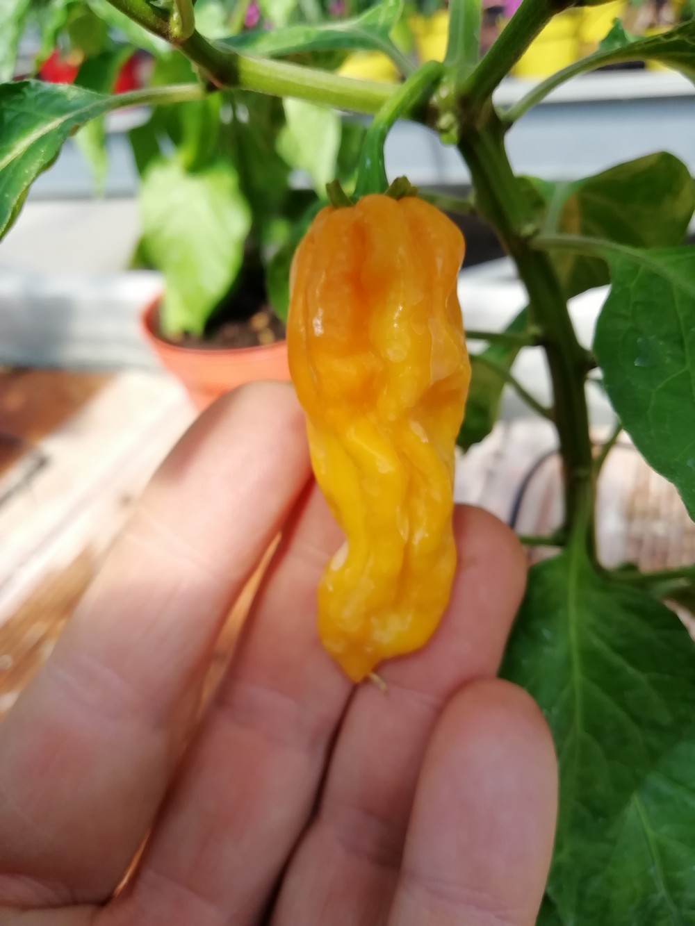 Dorset Naga Orange è un peperoncino originario dell’Inghilterra, si tratta di una selezione di Naga Morich creata dai coniugi inglesi Michael e Joy Michaud che ha subito una mutazione del colore. La pianta si presenta mediamente vigorosa, adatta alla coltivazione in vaso. I frutti sono di forma conica ed allungata, 3-4 centimetri, con la buccia quasi liscia, all’inizio hanno colore verde per poi virare all’arancio. La piccantezza è nucleare, scoville compreso tra 850.000 e 950.000. Si consiglia l’utilizzo solo a chi è veramente esperto di piccantezza. Sapore fruttato e retrogusto dolce.
