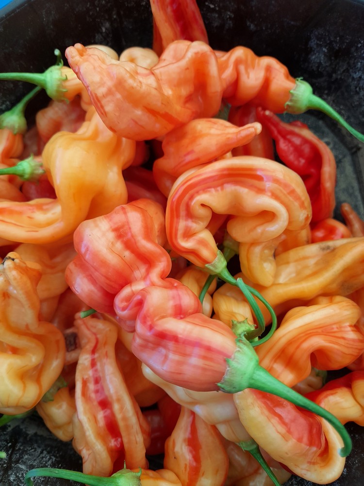 Sugar Rush Stripey è un peperoncino originario degli USA, in particolare è una variante di Sugar Rush peach. La pianta è vigorosa, altezza 80-100 centimetri, si può coltivare sia in vaso che in piena terra. Il fogliame è verde e i frutti sono pendenti ed allungati (8-10 centimetri) e di colore verde chiaro da acerbi, mentre a maturazione diventano arancioni con striature rosse. La piccantezza è media, scoville compreso tra 25.000 e 50.000. Il sapore è fresco e agrumato. Il frutto si adatta al consumo fresco in molte pietanze. Da Provare.